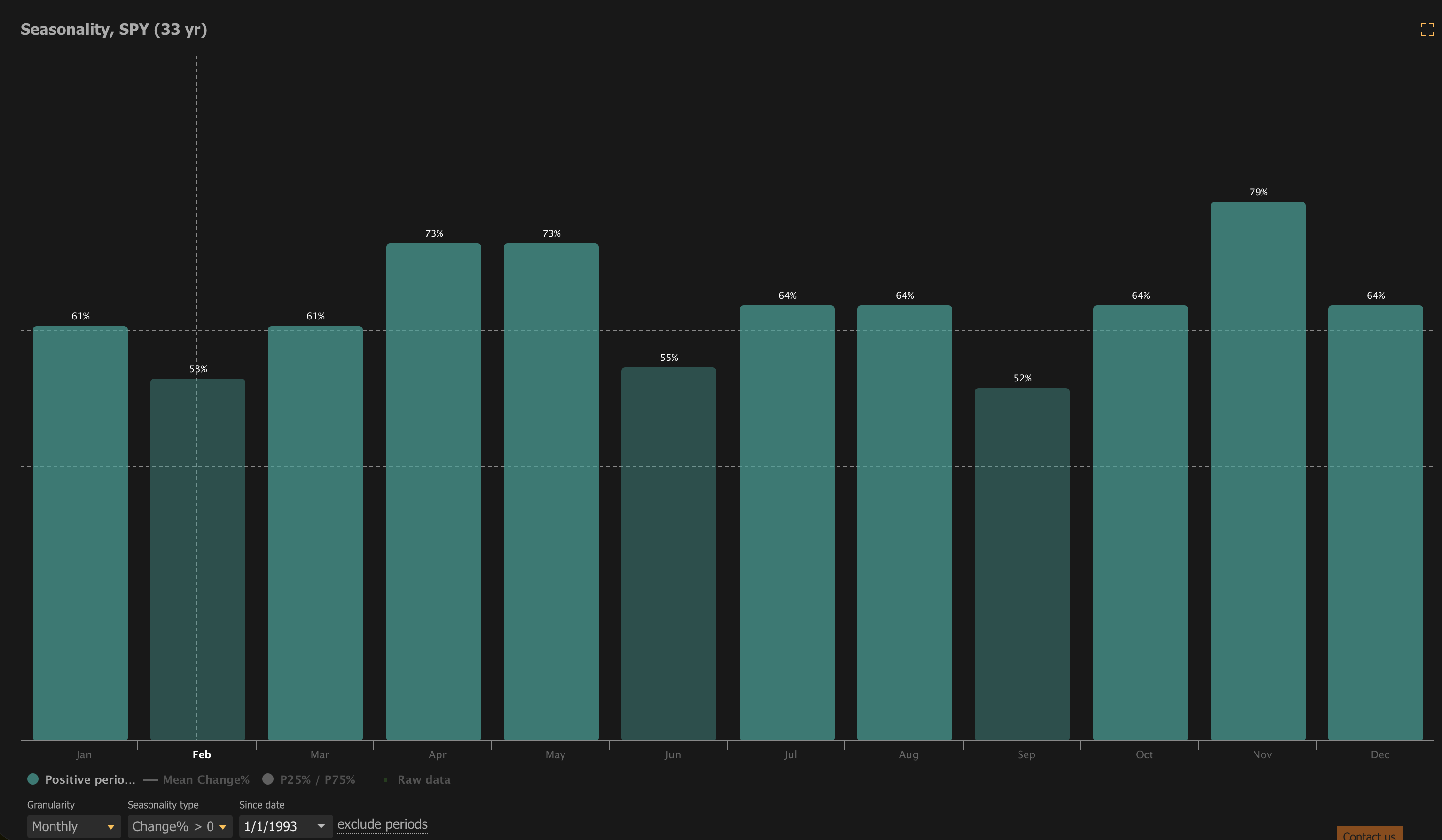 For example the seasonality chart, based on 33 years of price history in the SPY, shows that the market tends to have positive monthly returns 61% of the time in January and March, increasing to 73% in April and May. In contrast, the month of February is quite soft, with only 53% of the time having positive results, which is consistent with the concept of the market experiencing choppiness before ultimately breaking down.