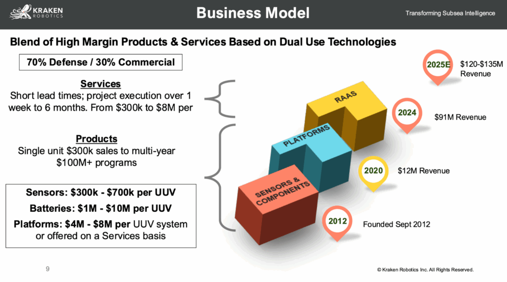 The partnership with Anduril Industries ($30B valuation, Palmer Luckey-founded) represents a multi-billion-dollar revenue opportunity. Kraken supplies $2-10M of technology per Ghost Shark XL-AUV and DiveLD platform. With Australia’s $1.7B Program of Record announced September 2025 for “dozens” of Ghost Sharks (deliveries starting January 2026), Anduril’s Rhode Island facility is designed for production of more than 200 Dive-LD units per year at full capacity, and additional orders from US Navy (Replicator program), Japan, South Korea, and allied nations, the partnership could generate $200-400M CAD annually by 2027, exceeding Kraken’s total current revenue in a single relationship.